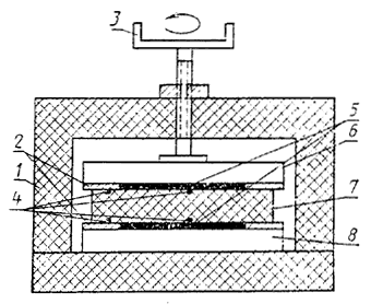 1 - теплоизоляционный кожух; 2 - охранная зона преобразователя теплового потока; 3 - прижимное устройство; 4 - преобразователи температуры; 5 - преобразователи теплового потока; 6, 8 - теплообменники; 7 - образец Теплообменники должны обеспечивать изотермические условия на поверхности образца. Перепад температуры между центральной и периферийной зонами верхней и нижней поверхностей образца должен быть не более 0,2 °С. При горизонтальном размещении образца в установке теплообменник с более высокой температурой должен располагаться сверху. Преобразователь теплового потока должен быть толщиной не более 5 мм и окружен охранной зоной из того же материала; ширина охранной зоны должна составлять не менее 0,25 размера преобразователя. Размер преобразователя с учетом охранной зоны должен быть равен размеру теплообменника. Преобразователь теплового потока размещают в центральной зоне поверхности теплообменника. Чувствительность преобразователя теплового потока должна быть не менее 0,1 мВ×м2/Вт. Преобразователи температуры должны быть градуированы в диапазоне температур, соответствующем назначению установки; результаты градуировок должны быть согласованы с таблицами номинальных статистических характеристик, приведенных в ГОСТ 3044-84. Преобразователи теплового потока градуируют на метрологически аттестованном устройстве либо непосредственно в установке для определения теплопроводности с использованием образцовых мер теплопроводности, аттестованных в установленном порядке. Блок задания и регулирования температуры должен обеспечивать поддержание заданной температуры рабочих поверхностей теплообменников в диапазоне минус 40 - плюс 700°С с погрешностью не более 5%. Погрешность термостатирования - не более 0,5% в диапазоне температур минус 40 - плюс 40°С. Для поддержания заданных температур теплообменников используют электронагреватели и жидкий охлаждающий агент (вода, жидкий азот и др.) Блок коммутации и измерения сигналов от преобразователей должен обеспечивать их подключение ко вторичному измерительному прибору постоянного тока. В качестве вторичного измерительного прибора следует использовать цифровой прибор класса 0,2, чувствительность которого не менее 1 мкВ. Узел зажима образца должен обеспечивать возможность смещения одного из теплообменников на расстояние не менее 100 мм от поверхности другого. Для обеспечения надежного теплового контакта образца с теплообменниками один из них должен иметь устройство, позволяющее отклонять теплообменник на угол до 15° от проектного положения. Узел зажима должен также обеспечивать возможность сжатия образцов мягких материалов с усилием, достаточным для уплотнения материала до заданного значения. Теплоизоляционный кожух должен быть выполнен из эффективного теплоизоляционного материала толщиной не менее 50 мм. Установку для определения теплопроводности и образцовые меры размещают в помещении, снабженном приточно-вытяжной вентиляцией и защищенном от действия прямой солнечной радиации. Блок коммутации и измерений установки при определении теплопроводности при средней температуре испытания образцов выше 100°С устанавливают в помещении, отделенном от остальных блоков установки газонепроницаемой перегородкой. Поверку установки для определения теплопроводности проводят не ре