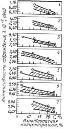 Наилучший способ ликвидировать эффект увеличения давления взрыва при наличии в системе противовзрывной защиты технологического оборудования методом разгерметизации сбросного трубопровода - подача хладагента с интенсивностью (0,1¸0,5) 10-2 м3×м-2×с-1 в поперечное сечение трубопровода непосредственно за мембраной до ее срабатывания или одновременно с ним. При наличии орошения в трубопроводе и использовании приемной емкости, находящейся под разрешением, длина трубопровода (по результатам экспериментов до 30 м) не оказывает заметного влияния на максимальное давление взрыва.
