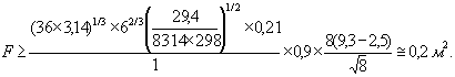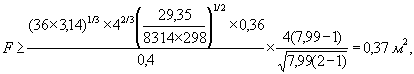 Для бензоло-воздушной смеси стехиометрического состава при атмосферных условиях Sui=0,36 м×c-1; Ei=7,99; Мi=(78×0,027+28×0,973) кг×кмоль-1=29,35 кг×кмоль-1. Для систем разгерметизации со сбросным трубопроводам без орошения истекающих продуктов хладагентом вне зависимости от объема сосуда c=4. Так как pm=0,2 МПа/1 МПа=2, то расчет площади разгерметизации проводим по критериальному соотношению (158). Выбрав в качестве значения коэффициента расхода m=0,4, получаем выражение