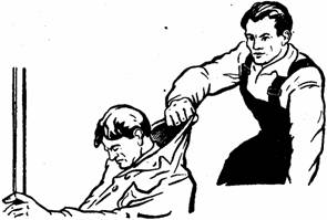 если тонущий схватил оказывающего помощь за шею сзади, нужно одной рукой захватить кисть руки тонущего, а другой - подтолкнуть локоть этой же руки. Затем оказывающий помощь должен резко перебросить руку тонущего через свою голову и, не освобождая руки, повернуть тонущего к себе спиной и буксировать его к берегу (рис. 37);