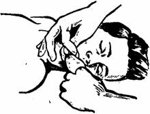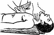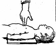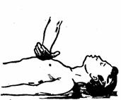 При установлении факта попадания инородного тела в дыхательное горло пострадавшего, находящегося в сознании или без него, при резко выраженной синюшности лица, неэффективности кашля и полной закупорке (при этом кашель отсутствует) любая процедура, которая может показаться эффективной, всегда оправдана, так как является «актом отчаяния». При этом пострадавшему наносят три - пять коротких ударов кистью в межлопаточной области при наклоненной вперед голове или в положении лежа на животе. Если это не поможет, охватывают стоящего пострадавшего сзади так, чтобы кисти оказывающего помощь сцепились в области между мечевидным отростком и пупком и производят несколько (три - пять) быстрых надавливаний на живот пострадавшего. Можно выполнять подобную процедуру и в положении пострадавшего лежа на спине: располагая ладони кистей между пупком и мечевидным отростком, энергично надавливают (3-5 раз) на живот.