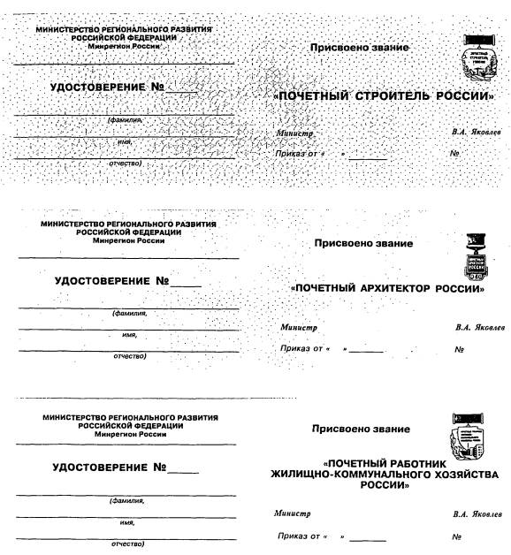 1. Утвердить Положение о нагрудном знаке "Почетный архитектор России" (Приложение N 1), его описание (Приложение N 2), "Почетный работник жилищно-коммунального хозяйства России" (Приложение N 3), его описание (Приложение N 4), "Почетный строитель России" (Приложение N 5), его описание (Приложение N 6).