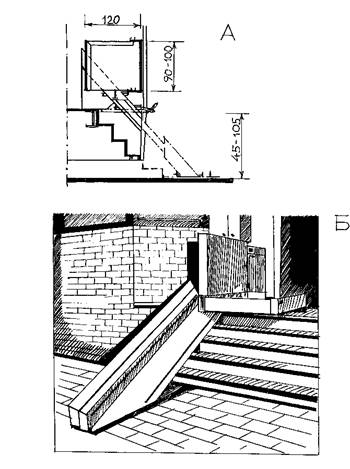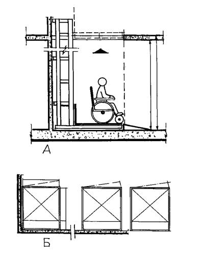 Рис. 4. Вертикальный подъемник на один этаж для инвалидов на креслах-колясках: А - разрез; Б - план подъемника