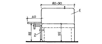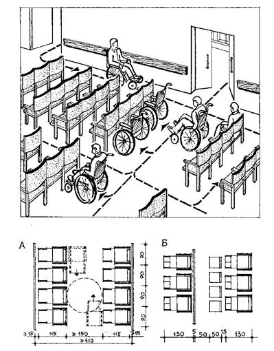 Сбоку от кровати для инвалида должно быть предусмотрено место для разворота кресла-коляски на 180°. 3.4. Все квартиры, кроме однокомнатных, оборудуются раздельными санитарными узлами, в которых предусмотрены специальные устройства и оборудование. Для самостоятельного пользования ванной возле нее устраивается пересадочная площадка, над которой закрепляют металлические штанги: с их помощью инвалид, подтягиваясь на руках, переносит себя из кресла-коляски на пересадочную площадку, а с нее - в ванну, 3.5. В подвальном или цокольном этаже жилого дома в расчете на каждую квартиру инвалида, пользующегося креслом-коляской, следует предусматривать стоянку, предназначенную для хранения уличной коляски» проведения технического ухода за коляской и ее ремонта*. Помещение для стоянки уличной коляски с учетом места для пересадки в нее должно быть 200×215 см. При этом лифт должен доходить до уровня пола подвала, а для въезда и выезда уличных колясок необходим пандус с уклоном не более 5% (1:20). Стоянки оборудуются опорными напольными поручнями или подвесными ручками, траншеями для пересаживания инвалида. 3.6. Для временного проживания предназначены гостиничные номера первого и второго разряда на одного человека (площадь не менее 11 м2), на двух человек (не менее 18,5 м2), при каждом номере проектируется санитарный узел и прихожая. *Если при жилом комплексе запроектирован закрытый гараж для автомобилей инвалидов, стоянка для уличных колясок не предусматривается. 3.7. В санитарных узлах размещаются унитаз, умывальник, полибан или душ с трапом - для одноместных номеров; площадь его не менее 4,5 м2. Санитарные узлы при двухместных номерах площадью не менее 5,3 м2 оборудуются унитазом, биде, умывальником, полибаном или душем с трапом. 3.8. Все санитарные узлы, помещения кухонь в квартирах и гостиничных номерах оборудуются специальными устройствами и приспособлениями, что позволяет инвалидам быть самостоятельными и обходиться без посторонней помощи. 4. ПОМЕЩЕНИЯ КУЛЬТУРНО-БЫТОВОГО ОБСЛУЖИВАНИЯ, АДМИНИСТРАЦИИ И УЧЕБНО-ПРОИЗВОДСТВЕННОГО НАЗНАЧЕНИЯ4.1. В жилом комплексе для молодых инвалидов предусматриваются следующие помещения общественного назначения: зрительный зал с комнатами для артистов и фойе; библиотека-читальня и кружковые комнаты; кафе-столовая (с магазином кулинарии и столом заказов); кухня для самообслуживания и холл для отдыха при гостиничных номерах; помещения учебно-производственного назначения; служебные и обслуживающие помещения. 4.2. Число мест в зрительном зале необходимо принимать из расчета 70-80 % проживающих, из них около половины - для инвалидов на креслах-колясках. 4.3. Стационарные полумягкие кресла в зале устанавливаются таким образом, чтобы за их спинками, в соответствии с разметкой, оставалась свободная зона для размещения инвалидов на креслах-колясках. Такое распределение мест позволит инвалиду быть вместе со здоровыми членами семьи, а также четко разграничить потоки въезда и выезда колясочников из зала. Количество мест в ряду должно быть при односторонней эвакуации ряда не более 12, при двухсторонней - не более 25, ширина прохода между рядами - не менее 0,55 м. Площадь зала принимается, исходя из того, что на одного инвалида на кресле-коляске приходится 2,4 м2, передвигающегося с помощью костылей - 1,2 м2, на одного здорового человека - 0,9-1 м2.