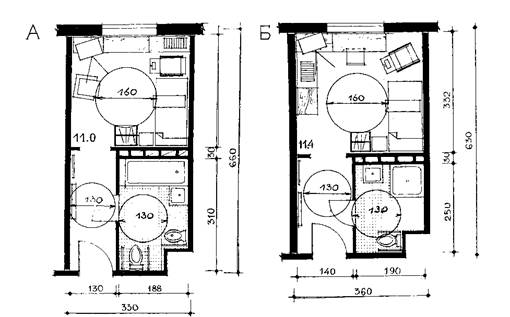Рис. 19. Временное жилище жилого комплекса - гостиничные номера на одного человека - инвалида на кресле-коляске. Варианты: А - с поперечным шагом 330 см (санитарный узел состоит из ванны, умывальника, унитаза и бидэ); Б - с поперечным шагом 360 см (санитарный узел состоит из полибана, умывальника, унитаза)