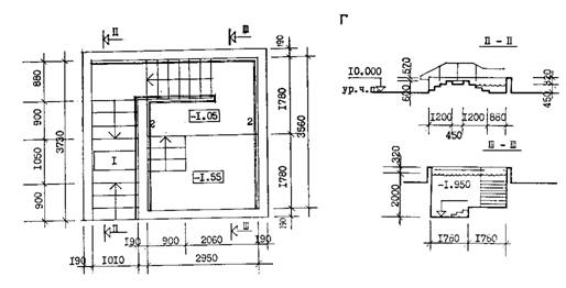 для подводного вытяжения: В - план Г - разрезы; 1 - ванна для дезинфекции ног; 2 - поручень