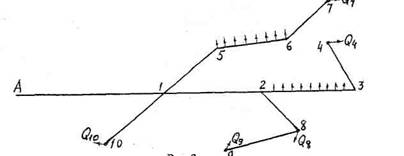 Ответвления магистрали разделяют ее на простые участки с постоянным расходом в пределах каждого участка (см. рис. 3). Расчетный расход Qp на каком-либо участке равен сумме всех расходов, забираемых из сети в конце и ниже (по движению воды) этого участка. Если на участке имеется равномерно распределенный по длине Qn путевой расход Q = ql, то расчетный расход равен сумме Q и 0,55Qп. Для нижерасположенных участков Qn учитывается полной величиной. Таким же способом вычисляется расчетный расход и на участках ответвлений при расчете диаметра.