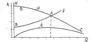 при пересечении характеристики насоса Н = f1(Q)(кривая ВС), взятой из справочных данных [10], и характеристики трубопровода (кривая ДЕ), представляющей собой потребный напор Н при различных подачах Q.