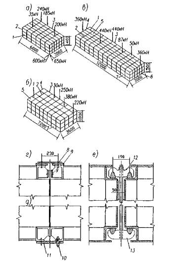 1 - временная опора из инвентарных конструкций; 2 - монтажный кран; 3 - приемная консоль; 4 - соединительные элементы; 5 - обстройка опор; 6 - самоподъемная плавучая платформа; 7 - шпренгель Рисунок 2 - Схемы полунавесного, навесного и уравновешенно-навесного монтажа решетчатых пролетных строений 8.2 Монтаж сплошностенчатых стальных и сталежелезобетонных пролетных строений балочно-неразрезных систем рекомендуется выполнять по схемам, приведенным на рисунке 3: а - полунавесной монтаж с устройством временных промежуточных опор. Главные балки переменной высоты; б - то же, с использованием самоподъемной плавучей платформы как временной опоры, перемещаемой из пролета в пролет; в - навесной монтаж с усилением пролетного строения шпренгелем; г - навесной монтаж балочно-подпружного пролетного строения с двух сторон с замыканием в середине пролета.