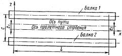lр - расстояние между внутренними гранями соседних ребер; В - расстояние между наружными гранями ребер; ls - длина шпалы; е - смещение оси пути относительно оси пролетного строения (положительное при смещении оси пути в сторону балки 1);