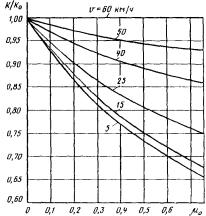 Рис. 7.3. График для расчета допустимой скорости движения поездной нагрузки Допустимую скорость движения нагрузки устанавливают по графику на рис. 7.3. Для этого на график наносят точку, отвечающую вычисленному значению К/К0 и динамической добавке m0. Динамическую добавку m0 определяют: для главной балки по формуле