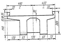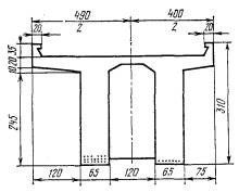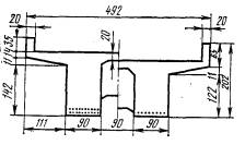 где Rs - расчетное сопротивление растянутой арматуры, принимаемое согласно п. 2.2; Ra - допускаемое напряжение для растянутой арматуры по нормам, по которым проектировали пролетное строение (см. приложение 8); j - относительное изменение площади сечения арматуры, вычисляемое по формуле (6.1). Расчет главной балки 5.3. Допускаемую временную нагрузку по прочности для расчетного сечения главной балки следует определять по формуле