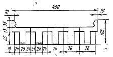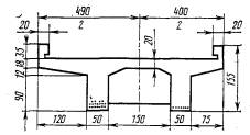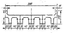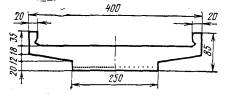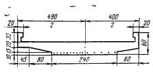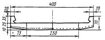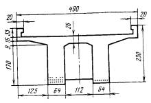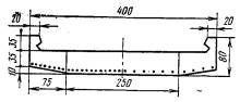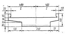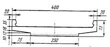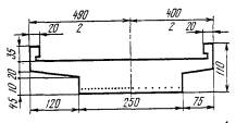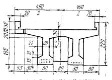 * По нормам 1947 г. ПРИЛОЖЕНИЕ 9ПРИМЕР ОПРЕДЕЛЕНИЯ ГРУЗОПОДЪЕМНОСТИ ПРОЛЕТНОГО СТРОЕНИЯ С НЕНАПРЯГАЕМОЙ АРМАТУРОЙ НА ОСНОВЕ СОПОСТАВЛЕНИЯ РАСЧЕТНЫХ НОРМОпределим грузоподъемность двухребристого пролетного строения проектировки Гипротранса в 1931 г. под нагрузку Н7 с расчетным пролетом l = 10,8 м, построенного в 1933 г. Расчет этого пролетного строения по опалубочным и арматурным чертежам дан в приложении 6, где приведены также результаты его обследования. Поскольку пролетное строение запроектировано в 1931 г., принято, что расчет его выполнялся в соответствии с техническими условиями 1931 г. 1. Расчет плиты балластного корыта. Коэффициент