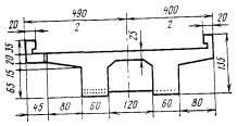 где Rp - расчетное сопротивление растяжению напрягаемой арматуры, принимаемое по табл. 2.2; SApi - площадь сечения отогнутых напрягаемых пучков, пересекаемых расчетным сечением; a - угол наклона отогнутых напрягаемых пучков к горизонту; остальные величины см. в п. 4.9. Длина проекции наиболее опасного наклонного сечения определяется по правилам, изложенным в п. 4.9. При этом расчет на участках длиной 2h0 от опорного сечения выполняют для наклонных сечений с углом наклона к опорному (вертикальному) сечению 60°. Классы главных балок по прочности для некоторых типовых пролетных строений с напрягаемой арматурой (при е = 0 и hb = 0,4 м)