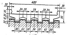 если x' £ hf, то х' и Ired следует определять по формулам (4.40) и (4.41) с заменой b на bf; Мp - изгибающий момент от постоянных нагрузок, вычисляемый согласно указаниям п. 4.6 при пp=п'р=1; аu - расстояние от растянутой грани сечения до оси ближайшего ряда арматуры (см. рис. 4.2); остальные обозначения см. пп. 4.6-4.7 и разд. 2. 5. ОПРЕДЕЛЕНИЕ ГРУЗОПОДЪЕМНОСТИ ПРОЛЕТНЫХ СТРОЕНИЙ С НЕНАПРЯГАЕМОЙ АРМАТУРОЙ НА ОСНОВЕ СОПОСТАВЛЕНИЯ РАСЧЕТНЫХ НОРМОбщие указания 5.1. Определение грузоподъемности пролетных строений по данному способу основано на расчете плиты балластного корыта и главных балок в рас четных сечениях (см. п. 1.10) путем сопоставления расчетных норм, по которым проектировалось сооружение, и действующих нормативных документов. Данный способ допускается применять при наличии: сведений о расчетной временной нагрузке и нормах или технических указаниях, по которым было запроектировано пролетное строение (см. приложения 7, 8); сведений об арматурной стали, использованной в пролетном строении в качестве рабочей арматуры; данных о фактической прочности бетона (см. раздел 8). При отсутствии сведений о нормах на проектирование допускается принять, что пролетное строение запроектировано по действовавшим в год изготовления (постройки) сооружения техническим условиям. Пример определения грузоподъемности пролетного строения с ненапрягаемой арматурой на основе сопоставления расчетных норм приведен в приложении 9. Расчет плиты балластного корыта 5.2. Допускаемую временную нагрузку по прочности следует определять по формулам (см. рис. 4.1): для сечения внешней консоли плиты, расположенного на расстоянии z от наружной грани ребра,