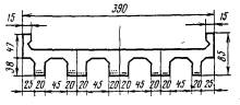 где Кн = 7 - класс временной нагрузки, на которую рассчитывалось пролетное строение в единицах эталонной нагрузки Н7; 1 + m1 = 1,2 - динамический коэффициент при 5 м < l £ 20 м - по нормам 1931 г. (см. приложение 8); p1 = pp + pb = 7,06 + 10,00 = 17,06 кН/м - постоянная нагрузка на монолитный участок плиты между ребрами. Остальные величины приведены в приложении 6. Класс по прочности для монолитного участка плиты между ребрами