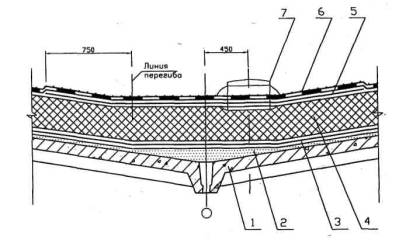 1 - несущая железобетонная плита; 2 - пароизоляция; 3 - утеплитель; 4 - выравнивающая стяжка; 5 - грунтовка; 6 - наплавляемый рулонный материал; 7 - защитный слой - крупнозернистая посыпка на верхнем слое рулонного материала.