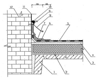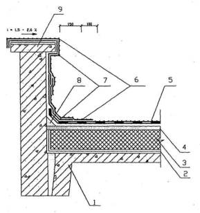 Особого внимания требует устройство внутренних водостоков, а также мест примыкания изоляционных слоев к стенам, парапетам и другим выступающим над кровлей элементам и конструкциям. Пример конструктивного решения кровли из наплавляемых рулонных материалов представлен на рис. 1.