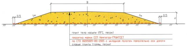 6. Технология производства работСтроительство насыпей 6.1 При устройстве прослоек из геосинтетических материалов при отсыпке насыпей в применяемые обычно технологии дополнительно вводятся операции: - подготовка основания - транспортировка, распределение по участку рулонов, их укладка, крепление и при необходимости соединение полотен между собой; - отсыпка на геосинтетические материалы вышележащего слоя, его распределение и уплотнение. 6.2 Применение защитно-армирующих прослоек из геосеток ССП Нефтегаз-ГРУНТСЕТ, ССНП Нефтегаз-ГРУНТСЕТ, ПС-ПОЛИСЕТ (в сочетании с неткаными материалами) в основании насыпи при строительстве временных дорог или дорог низких категорий на слабых грунтах осуществляют для снижения неравномерности осадки, а также с целью уменьшения толщины насыпного слоя низких насыпей. При этом снижается колейность от движения транспорта при устройстве низких насыпей. При сооружении временных автомобильных дорог, подъездов, площадок, построечных дорог с низшими типами покрытий, использование геосеток в качестве армирующей и одновременно защитной (разделительной) прослойки на границе между насыпным и подстилающим грунтом позволяет улучшить условия движения транспортных и уплотняющих средств. Защитные (разделительные) прослойки из геосеток рекомендуется применять также в тех случаях, когда нижняя часть насыпи возводится из торфа или глинистого грунта повышенной влажности. При этом разделительные прослойки размещают на границе контакта грунтов различного состава, что обеспечивает повышение несущей способности земляного полотна. Минимальную толщину насыпи назначают по расчету или ориентировочно по таблице 1: Таблица 1