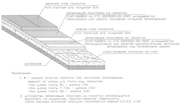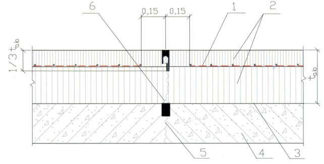 1 - геосетка ССНП по СТО 00205009-001-2005 ; 2 - верхний и нижний слои асфальтобетона; 3 - подгрунтовка горячим битумом; 4 - существующее жесткое покрытие; 5 - шов сжатия; 6 - возбудитель трещины |