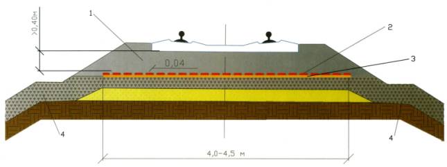 1 - очищенный щебень; 2 - полимерная геосетка ПС 100/100-50-ПОЛИСЕТ по СТО 00205009-003-2006 3 - геотекстиль; 4 - загрязненный балласт |