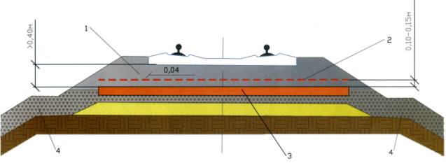 1 - очищенный щебень; 2 - полимерная геосетка ПС 100/100-50-ПОЛИСЕТ по СТО 00205009-003-2006 3 - пенополистирол; 4 - загрязненный балласт |