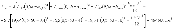 Sred = bbl·hmon·0,5(h - hmon) + λ·As,mon·- as,mon = 30·10·0,5(50 - 10) + 8,7·15,2·21 = 8777 см3;