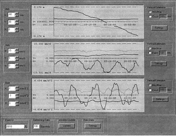 С помощью модуля «Фильтр Кальмана» в программе GOCA возможно постоянное вычисление позиции, скорости и ускорения для каждой объектной точки. Результирующие данные изображаются в графике, для каждого компонента отдельно (рис. 4.4). Разработка мощного стандарта оповещения для программы GOCA происходит в настоящее время на основе модуля «Фильтр Кальмана».