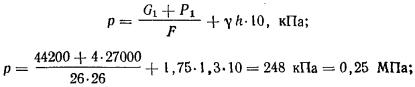 Для определения расчетного давления на основание предварительно находим следующие величины по табл. 16, 17 и п. 3.52 главы СНиП на проектирование оснований зданий и сооружений: А = 2,46; В = 10,84; D = 11,73; m1 = 1,4; m2 = 1,4 и kн = 1,1. Расчетное давление на основание определяем по п. 3.50 той же главы СНиП: