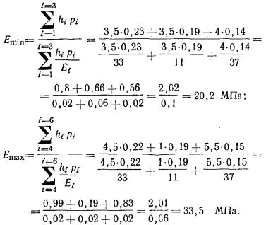 Используя найденные значения рz, вычисляем по формуле (14) настоящего Руководства приведенные модули деформации основания Emin под серединой левой стороны фундамента и Еmax под правой: