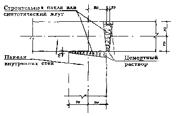 Рис. 4. Замоноличенный вертикальный стык между панелями наружных и внутренних стен В другом варианте заделки вертикальных стыков наружных стеновых панелей в качестве заполнителя используется пенопласт ФРП-1, которым по методу заливки исходной композиции заполняется (поэтажно) вся полость вертикального стыка в соответствии с требованиями ВСН 17-94 /б/. Степень заполнения стыка ФРП-1 определяется после его распалубки. Пенопласт должен заполнять весь объем стыка. В случае если заполнение неполное, следует вскрыть и ликвидировать причины некачественного заполнения стыка и этот участок заделать повторно. После удаления специальной опалубки в виде жгута из вспененного полиэтилена Вилатерм-С "опалубочные" полости вдоль стыка заделываются цементно-песчаным раствором снизу доверху на глубину до пенопласта. 3.8. Закрытые стыки (рис. 5) между внутренней и наружной стенами заделываются аналогично стыкам между панелями внутренних стен (см. п. 3.5). 3.9. Верхний горизонтальный и вертикальные стыки по периметру межкомнатных перегородок необходимо проконопачивать смоченной в гипсовом растворе паклей или синтетическим жгутом и оштукатурить раствором с обеих сторон на глубину не менее 20 мм (рис. 6). Нижний горизонтальный стык, а также трещины и щели необходимо оштукатурить цементным раствором с обеих сторон. 3.10. Для обеспечения звукоизоляции внутренних стен и перегородок с дверью просвет между дверным полотном и полом должен быть не более 10 мм. Стык между коробкой дверного проема и откосом панели должен быть тщательно заделан строительной паклей, синтетическим жгутом или другим материалом, согласованным для применения. Наличники, закрывающие стык, должны плотно прилегать к дверной коробке и телу внутренней стены перекрытия их. 3.11. Требуемая звукоизоляция балконных дверей и окон обеспечивается соблюдением технологии заделки стыков по контуру дверных и оконных блоков наружных стеновых панелей. Полость стыка плотно заполняется на глубину не менее 50 мм строительной паклей или прокладкой Вилатерм-СП Æ 30 мм, а остальная часть полости стыка синтетическим жгутом. После заделки стыка устанавливается наличник, который плотно прилегает к поверхности дверной (или оконной) коробки и откоса панели: