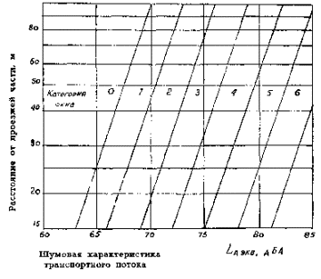 6. Категорию окон жилого дома, в зависимости от шумовой характеристики транспортного потока и расстояния жилого дома от проезжей части улицы, определяют по графику рис. 10.