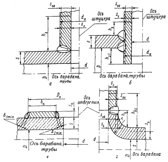 где i=1, 2, 3, ..., n. В случае, если штуцер устанавливается в гнезде с полным проплавлением на глубину не менее h3, расчет условного диаметра отверстия dy допускается производить по значениям двух расточек (d1, h1 и d2, h2); для овальных отверстий - равными размеру отверстия в направлении ряда, рассматриваемого при определении коэффициента прочности; для соседних отверстий ряда, имеющих разные диаметры, - равными среднеарифметическому значению диаметров; Рисунок 4.3. Типы соединения труб (штуцеров) с расчетной деталью а - отверстие с завальцованной трубой (штуцером); б - отверстие с приварным штуцером (трубой) без полного проплавления толщины стенки штуцера (конструктивный зазор); в - отверстие с приварным штуцером (трубой) при полном проплавлении толщины стенки штуцера; г - отверстие с приварным штуцером (трубой) при полном проплавлении толщины стенки расчетной детали Рисунок 4.4. Отверстие с различными диаметрами по толщине стенки для цилиндрических деталей и выпуклых днищ с отбортованным внутрь или наружу воротником или с вытянутой горловиной - равными эквивалентному диаметру, определенному по формуле