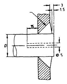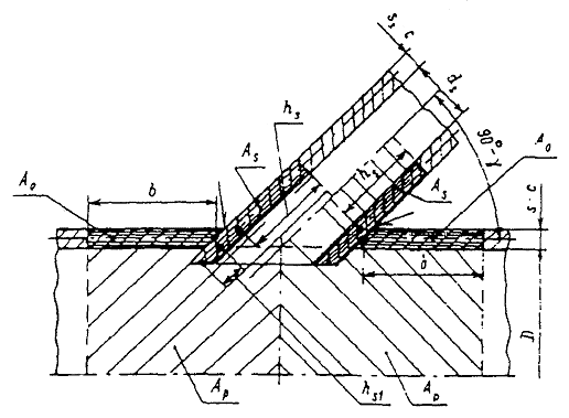 Примечание. При расчетной температуре от 510 до 530°С коэффициент прочности сварного соединения при изгибе определяется линейным интерполированием между указанными значениями. Если расчетная деталь изготовлена из листа, то значения коэффициентов прочности сварного соединения при изгибе допускается принимать по таблице 4.2 как для механически обработанных труб. При изготовлении деталей из полуфабрикатов с полем допусков толщины стенки более 10% коэффициенты прочности сварного соединения при изгибе следует принимать по таблице 4.2 как для катаных труб. 4.2.1.7. Для хромомолибденованадиевых и высокохромистых сталей при расчетной температуре более 510°С и ресурсе 3×105 ч значения коэффициентов прочности должны быть уменьшены на 0,1 и составят 0,6 и 0,8 вместо 0,7 и 0,9 согласно п. 4.2.1.1 и 0,5 и 0,6 вместо 0,6 и 0,7 согласно п. 4.2.1.6. Для ресурса от 2×105 до 3×105 ч значения коэффициентов прочности сварного соединения определяются линейным интерполированием между указанными значениями. 4.2.2. Коэффициенты прочности угловых сварных соединений и соединений внахлестку 4.2.2.1. При расчете угловых и тавровых сварных соединений на все виды нагрузок (кроме сжатия) коэффициент прочности jw следует принимать не более 0,8 при контроле радиографией или УЗК по всей длине шва и не более 0,6 при выборочном контроле или при отсутствии контроля. 4.2.2.2. При расчете сварных соединений внахлестку на все виды нагрузок коэффициент прочности jw, следует принимать не более 0,6. 4.3. Коэффициенты прочности, учитывающие наличие отверстий4.3.1.1. При определении коэффициентов прочности jd или jc диаметр отверстия для каждого расчетного сечения следует принимать: для отверстий, в которых трубы развальцованы или приварены к наружной поверхности детали без расточки гнезда или с углублением для установки штуцера менее 30% толщины стенки или с углублением 30% и более, но с обеспечением полного проплавления толщины стенки штуцера и заполнением гнезда наплавленным металлом, а также для лючковых отверстий - равными диаметру отверстия в соответствии с рисунком 4.3; для отверстий, имеющих по толщине стенки расточки с несколькими разными диаметрами, например с тремя диаметрами согласно рисунку 4.4. - равными условному диаметру, определенному по формуле