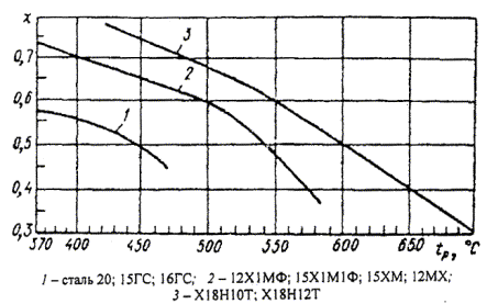 если расчет выполняется по внутреннему диаметру, При выполнении контрольных расчетов по данным измерений толщины стенки вместо s-с следует применять sf-с2 согласно п. 3.2.2.2. Значения коэффициентов прочности j и прибавки с следует принимать согласно пп. 3.2.1.2 и 3.2.1.4 соответственно. 3.2.4. Расчетная температура стенки 3.2.4.1. Расчетную температуру стенки барабанов и охлаждающих топку слоевого сжигания панелей из углеродистой или теплоустойчивой стали, содержащих воду, пароводяную смесь или насыщенный пар, допускается определять без теплотехнических расчетов по упрощенным формулам для средней температуры стенки: для барабанов, вынесенных из газохода, надежно изолированных или защищенных другим надежным способом от обогрева извне: t = tm; для неизолированных барабанов, расположенных в конвективных газоходах: при температуре газов не выше 600°С t= tm+1,2s+10°С; при температуре газов более 600°С, но не выше 900°С t= tm+2,5s+20°С; для неизолированных барабанов и охлаждающих панелей, подверженных лучеиспусканию факела или горящего слоя топлива: t= tm+4s+30°С. 3.2.4.2. Расчетную температуру стенки коллекторов экранов, экономайзеров и перегревателей допускается определять по упрощенным формулам: для необогреваемых (вынесенных из газохода или надежно изолированных) коллекторов экономайзеров и экранов и коллекторов насыщенного пара котлов с естественной и принудительной циркуляцией, а также входных коллекторов экономайзеров прямоточных котлов t = tm; для необогреваемых коллекторов (за исключением входных) экономайзеров прямоточных котлов и коллекторов перегревателей (кроме насыщенного пара) котлов всех типов t = tm+xDt, для обогреваемых коллекторов из углеродистой и теплоустойчивой стали, содержащих воду, пароводяную смесь или насыщенный пар: при температуре в газоходе не выше 600°С t = tm+s+xDt+10°С, при температуре в газоходе от 600 до 900°С t = tm+2s+xDt+20°С, при температуре в газоходе выше 900°С. t = tm+3s+xDt+30°С, Величина t не должна приниматься выше расчетной температуры газов в сечении газохода, в котором расположен коллектор. Температуру среды tm при определении расчетной температуры стенки для коллекторов экономайзеров (кроме входных), экранов котлов с естественной и принудительной циркуляцией и коллекторов насыщенного пара следует принимать равной температуре насыщенного пара при расчетном давлении в данном коллекторе. Для входных коллекторов экономайзеров котлов с естественной и принудительной циркуляцией температура среды должна приниматься равной температуре воды на входе в экономайзер (с учетом подогрева в пароохладителе в случае возврата воды после пароохладителя на вход в экономайзер и смешения при рециркуляции воды). Для коллекторов экономайзеров и переходных зон прямоточных котлов, а также для коллекторов перегревателей котлов всех типов она должна, приниматься равной температуре среды. Величина разверки температур во включенном в коллектор пучке Dt должна приниматься по тепловому расчету или по данным испытаний, но не менее 10°С. Коэффициент x, учитывающий перемешивание среды до входа в коллектор или в нем, должен приниматься равным 0,5, за исключением случаев, когда среда подводится к торцу коллектора; в этих случаях допускается принимать x=0. 3.2.4.3. Для обогреваемых коллекторов из аустенитной стали расчетная температура стенки должна приниматься средней 