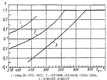 Нейтральная сторона колена составляет участок колена, расположенный под углом 15° в оба направления от продольного среднего сечения колена. 3.3.2.3. Для колен из углеродистой, легированной и аустенитной сталей, температура стенки которых не превышает 350, 400, 450°С соответственно, значения коэффициентов формы следует определять по формулам:
