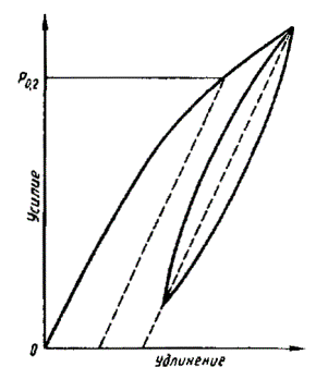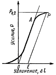 Скорость нагружения должна быть установлена в области упругости и поддерживаться по возможности достоянной, пока не будет достигнут верхний предел текучести sтв. При определении физического sт, и нижнего sтн пределов текучести скорость относительной деформации рабочей части образца на стадии текучести должна быть в пределах от 0,00025 до 0,0025 с-1, если в НТД на металлопродукцию не имеется других указаний. Скорость относительной деформации должна поддерживаться по возможности постоянной. Если скорость относительной деформации на стадии текучести не может быть обеспечена непосредственным регулированием испытательной машины, то испытание следует проводить, задавая скорость нагружения в области упругости. Скорость нагружения перед достижением стадии текучести должна быть в пределах, указанных в табл. 1б. При этом управление машиной не должно изменяться до конца стадии текучести. 4.5. Предел текучести условный с допуском на величину пластической деформации при нагружении s0,2 (или с иным установленным допуском) определяют по диаграмме, полученной на испытательной машине или с помощью специальных устройств. При разногласиях в оценке качества металлопродукции определение предела текучести условного производится по диаграмме растяжения, полученной с применением тензометра. Примечание. Условный предел текучести с допуском на величину пластической деформации при нагружении s0,2 (или с иным установленным допуском) может быть определен без построения диаграммы растяжения с помощью специальных приборов (микропроцессоров и др.) 4.5.1. Для определения предела текучести условного s0,2 (или с иным установленным допуском) по диаграмме растяжения вычисляют величину пластической деформации с учетом установленного допуска, исходя из длины рабочей части образца l или начальной расчетной длины по тензометру le. Найденную величину увеличивают пропорционально масштабу диаграммы и отрезок полученной длины ОЕ откладывают по оси удлинения от точки О (черт. 3). Из точки Е проводят прямую, параллельную ОА. Точка пересечения прямой с диаграммой соответствует усилию предела текучести условного при установленном допуске на величину пластической деформации. Масштаб диаграммы по оси удлинения должен быть не менее 50:1. При отсутствии испытательных машин с диаграммами указанного масштаба и возможности их получения с помощью специальных устройств допускается, за исключением случаев разногласий в оценке качества металлопродукции, использовать диаграммы с масштабом по оси удлинения не менее 10:1 при применении образцов с рабочей длиной не менее 50 мм. 4.5.2. Если прямолинейный участок диаграммы растяжения выражен нечетко, то рекомендуется следующий способ определения предела текучести условного s0,2 (или с иным установленным допуском) - черт. 3а. После того как ожидаемый условный предел текучести будет превышен, усилие на образец снижают до величины, составляющей примерно 10 % от достигнутого. Далее производят новое нагружение образца до тех пор, пока величина приложенного усилия не превысит первоначальную. Черт. 3* Черт 3а. Для определения усилия на диаграмме проводят прямую вдоль петли гистерезиса. Далее проводят параллельно ей линию, расстояние от начала которой до точки О диаграммы, отложенное по оси удлинения, соответствует допуску на величину пласти
