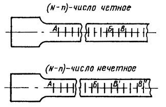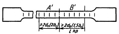 образцах с начальной расчетной длиной l0 не менее l0 = 11,3 Допускается определение относительного равномерного удлинения dр по диаграмме растяжения с масштабом по оси удлинения не менее 10:1 как соответствующего наибольшему усилию Rmax. 4.8.1. Относительное равномерное удлинение (dp), %, вычисляют по формуле dp = Черт. 4 4.8, 4.8.1. (Измененная редакция, Изм. № 3). 4.9. Для определения конечной расчетной длины образца lк разрушенные части образца плотно складывают так, чтобы их оси образовали прямую линию. Измерение конечной расчетной длины образца lк проводится штангенциркулем при значении отсчета по нониусу 0,1 мм. 4.9.1. Определение конечной расчетной длины образца проводится измерением расстояния между метками, ограничивающими расчетную длину. 4.9.2. Если расстояние от места разрыва до ближайшей из меток, ограничивающих расчетную длину образца, составляет 1/3 или менее начальной расчетной длины l0 и определенная величина относительного удлинения после разрыва не удовлетворяет требованиям нормативно-технической документации на металлопродукцию, то допускается проводить определение относительного удлинения после разрыва d с отнесением места разрыва к середине. Пересчет производят по заранее нанесенным вдоль рабочей части образца кернам или рискам, например через 5 или 10 мм (черт. 5). Черт. 5 Пример. На начальной расчетной длине образца l0 укладывается N число интервалов. После разрыва крайнюю риску на короткой части разрушенного образца обозначим А. На длинной части образца обозначим риску Б, расстояние от которой до места разрыва близко по величине к расстоянию от места разрыва до риски А. Расстояние от А до Б составляет n интервалов. Если разность (N - n) - число четное, то от