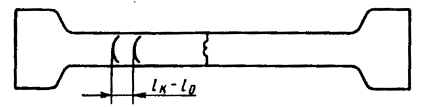риски Б до риски В берется lк = АБ + 2БВ. Если разность (N - n) - число нечетное, то от риски Б до риски В¢ берется lк = АБ + БВ' + БВ". 4.9.3. При наличии указаний в НТД при определении относительного удлинения после разрыва для малопластичных металлов (d £ 5 %) определяют: а) абсолютное удлинение lк - l0. Перед испытанием около одного из концов рабочей длины образца наносят едва заметную метку. С помощью измерителя на образце проводят дугу радиусом, равным начальной расчетной длине образца l0, и с центром в нанесенной метке. После разрыва обе половины образца плотно складывают и прижимают друг к другу под действием осевого усилия. Вторую дугу того же радиуса проводят из того же центра. Расстояние между дугами, равное абсолютному удлинению образца (черт. 6), измеряют с помощью измерительного микроскопа или других средств измерений; Черт. 6 б) конечную расчетную длину lк по диаграмме растяжения при масштабе диаграммы по оси деформации (удлинения) не менее 50:1; в) конечную расчетную длину образца lк по расстоянию между головками образца или метками, нанесенными на переходных частях образца, с применением расчетных формул. (Измененная редакция, Изм. № 2, 3). 4.10. Относительное удлинение образца после разрыва (d) в процентах вычисляют по формуле d = 4.10.1. В протоколе испытаний должно быть указано, на какой расчетной длине определено относительное удлинение после разрыва d. Например, при испытании