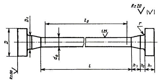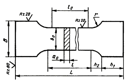 хрупких материалов допускается изготовлять с начальной расчетной длиной l0 = 2,82 При наличии указаний в НТД на металлопродукцию допускается применять и другие типы образцов, в том числе и непропорциональные, для которых начальная расчетная длина l0 устанавливается независимо от начальной площади поперечного сечения образца F0. (Измененная редакция, Изм. № 2). 1.9. Типы и размеры пропорциональных цилиндрических и плоских образцов приведены в приложениях 2 и 3. Тип и размеры образца должны указываться в нормативно-технической документации на правила отбора проб, заготовок и образцов или на металлопродукцию. Допускается применение при испытании пропорциональных образцов других размеров. Для плоских образцов соотношение между шириной и толщиной в рабочей части образца не должно превышать 8:1. 1.10. Форма и размеры головок и переходных частей цилиндрических и плоских образцов определяются способом крепления образцов в захватах испытательной машины. Способ крепления должен предупреждать проскальзывание образцов в захватах, смятие опорных поверхностей, деформацию головок и разрушение образца в местах перехода от рабочей части к головкам и в головках. 1.11. Предельные отклонения по размерам рабочей части цилиндрических и плоских образцов приведены в приложениях 2 и 3. Для литых механически обработанных цилиндрических образцов предельные отклонения по диаметру удваиваются. Предельные отклонения по толщине плоских образцов с механически не обработанными поверхностями должны соответствовать предельным отклонениям по толщине, установленным для металлопродукции. Предельные отклонения по толщине плоских образцов с механически обработанными поверхностями - ±0,1 мм. 1.12. Рабочая длина образцов должна составлять: от l0 + 0,5d0 до l0 + 2d0 - для цилиндрических образцов, от l0 + 1,5 При разногласиях в оценке качества металла рабочая длина образцов должна составлять: l0 + 2d0 - для цилиндрических образцов, l0 + 2 Примечание. При использовании тензометров допускается применение образцов с другими рабочими длинами l, величина которых больше указанных. (Измененная редакция, Изм. № 2). 1.13. Образцы маркируют вне рабочей длины образца. 2. АППАРАТУРА2.1. Разрывные и универсальные испытательные машины должны соответствовать требованиям ГОСТ 28840. 2.2. Штангенциркули должны соответствовать требованиям ГОСТ 166. Микрометры должны соответствовать требованиям ГОСТ 6507. Допускается применение и других измерительных средств, обеспечивающих измерение с погрешностью, не превышающей указанную в п. 3.1. 2.3. Тензометры должны соответствовать требованиям ГОСТ 18957. При определении предела пропорциональности и пределов текучести условных с допусками на величину пластической или полной деформации при нагружении или остаточной деформации при разгружении до 0,1 % относительная цена деления шкалы тензометра не должна превышать 0,005 % от начальной расчетной длины по тензометру le; при определении предела текучести условного с допуском на величину деформации от 0,1 до 1 % - не должна превышать 0,05 % от начальной расчетной длины по тензометру le. (Измененная редакция, Изм. № 2). 2.4. Линейки металлические должны соответствовать требованиям ГОСТ 427. 3. ПОДГОТОВКА К ИСПЫТАНИЮ3.1. Для определения начальной площади поперечного сечения F0 необходимые геометрические размеры образцов измеряют с погрешно