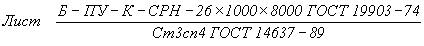 Лист нормальной точности (Б), улучшенной плоскостности (ПУ), с обжатой кромкой (К), размерами 26´1000´8000 мм по ГОСТ 19903 из стали марки Ст3сп, категории 4 по ГОСТ 14637: