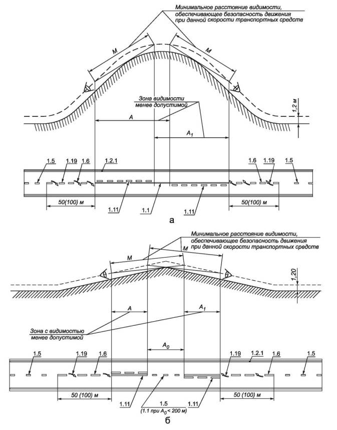 Рисунок В.6 - Примеры нанесения разметки на участках дорог с необеспеченной видимостью, где зоны видимости встречного автомобиля: а - перекрываются; б - не перекрываются
