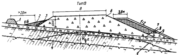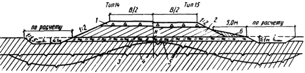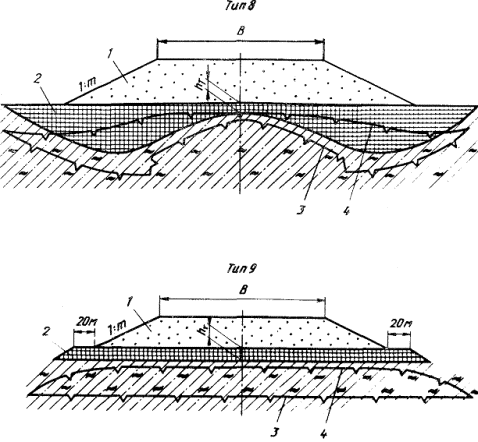 профиль насыпи с мерзлым грунтом в нижней части: 3.41. На плоскобугристых торфяниках, представляющих собой комплекс бугров высотой до 1 м, разделенных мочажинами шириной до 4 м и полосами стока, насыпи проектируют по первому принципу в соответствии с поперечными профилями, приведенными на рис.7. Для выравнивания ВГВМ предусматривают заполнение всех мочажин торфом в пределах ширины дорожной полосы (с запасом на осадку торфа). При пересечении полос стока толщина торфяного слоя в нижней части насыпи должна быть постоянной, равной не менее 0,3 м в уплотненном состоянии (см. рис.7, тип 9). Крутизну откосов назначают 1:2 при использовании песчаных грунтов, 1:1,5 - крупнообломочных. Рис.6. Поперечные профили насыпи на местности