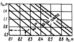 где hод - толщина дорожной одежды, м; hн - толщина верхней части (рабочего слоя) насыпи, м. 3.47. Ориентировочную толщину верхней части насыпи из крупнообломочного или песчаного грунта при капитальном типе дорожной одежды и различной толщи не теплоизолирующих слоев из торфа определяют по рис. 11. Во всех случаях толщина верхней части насыпи должна быть не менее 0,8 м по условию динамической устойчивости дорожной одежды. Рис.11. Зависимость высоты верхней части насыпи от толщины теплоизолирующего слоя из уплотненного торфа и среднемесячной максимальной за летний период температуры воздуха с 5%-ной обеспеченностью (цифры на кривых, °С) 3.48. Толщину нижней части насыпи из промороженных глинистых грунтов определяют по формуле