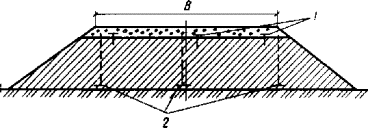 теплых периодов): Крутизну откосов торфяной насыпи назначают 1:2. Насыпь рассчитывают согласно обязательному приложению 6. 3.62. При пересечении глубоких логов и полос стока, а также на подходах к мостам через крупные водотоки (при соответствующем технико-экономическом обосновании, учитывающем требования охраны окружающей среды) допускается на грунтах I-IV категорий просадочности проектировать насыпь, возводимую способом гидромеханизации без обваловывания (рис. 21). Крутизну откосов в нижней части принимают 1:10 - 1:15, а в верхней - 1:2 для песчаного грунта при высоте волны до 0,4 м. Рис. 21. Поперечный