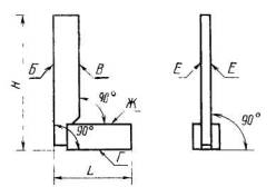 БВ - измерительные поверхности угольников, Г, Ж - опорные поверхности, Е - боковые поверхности Черт. 5 Примечание к черт. 1-5. Чертежи не определяют конструкцию угольников. 1.2. Основные размеры угольников типов УЛ; УЛП; УП и УШ должны соответствовать указанным в табл. 1. мм